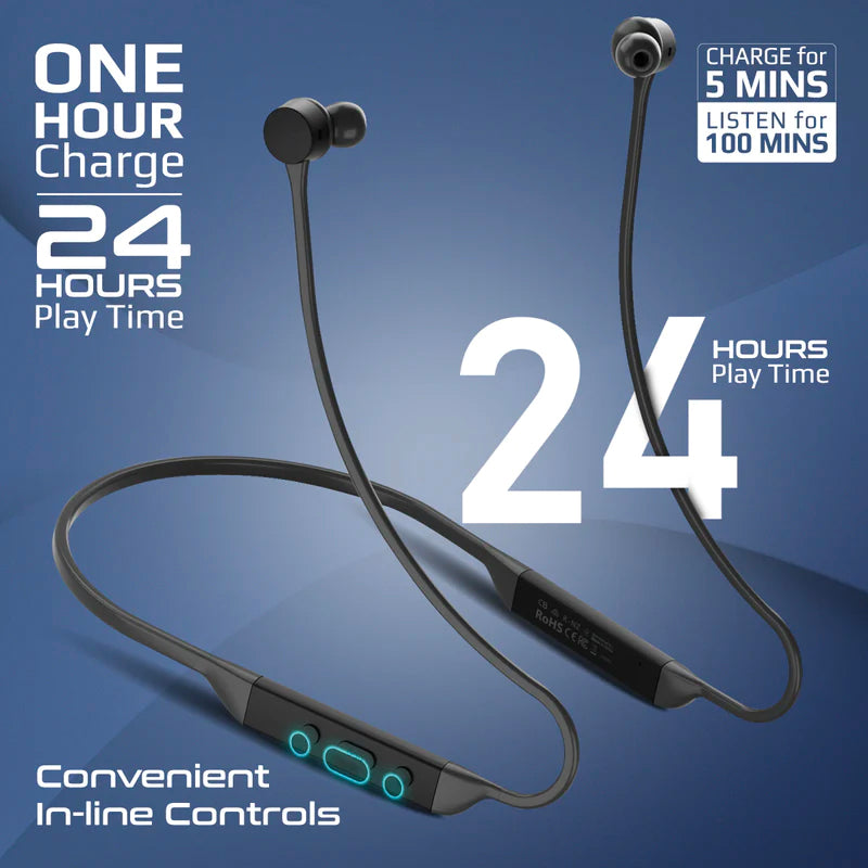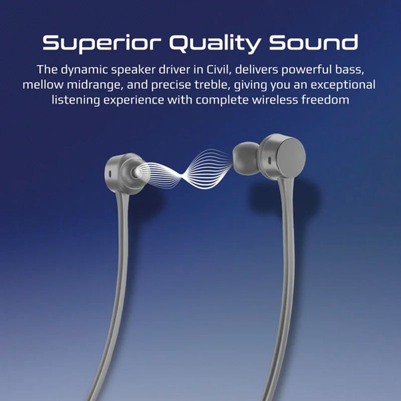 Civil neckband wireless earphones are designed to energize your exercise with acclaimed high-fidelity sound and a comfortable, stable fit. These sporty earphones not only look stylish but provides seamless Bluetooth V5.2 connectivity. The in-line audio controller and powerful mic, lets you take hands-free calls and control functions easily. Enjoy your music and also wireless listening freedom with Civil.